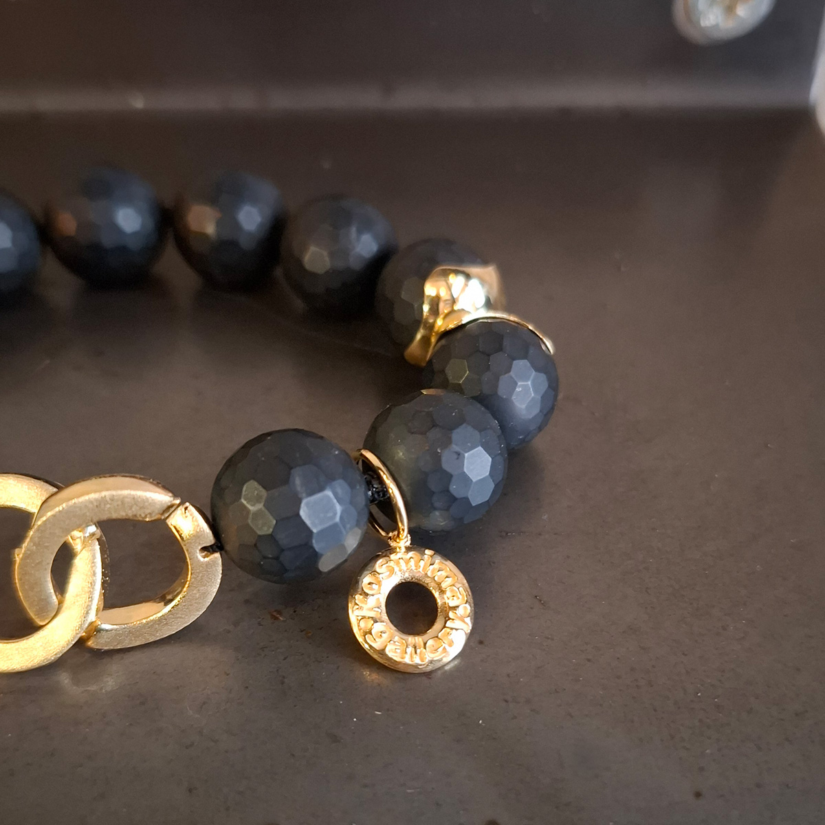 Μαύρος όνυχας, η πέτρα της αυτοκυριαρχίας και του αυτοελέγχου! Χειροποίητο βραχιόλι 20 εκατοστών, με πέτρες ταγιέ 14 χιλιοστών, περασμένες σε μεταξοκλωστή με κόμπους ενδιάμεσα και επίχρυσες λεπτομέρειες από ασήμι 925ο. Συνδυάστε το με το ίδιο κολιέ ή ενώστε τα και δημιουργείστε ένα μακρύτερο κολιέ!