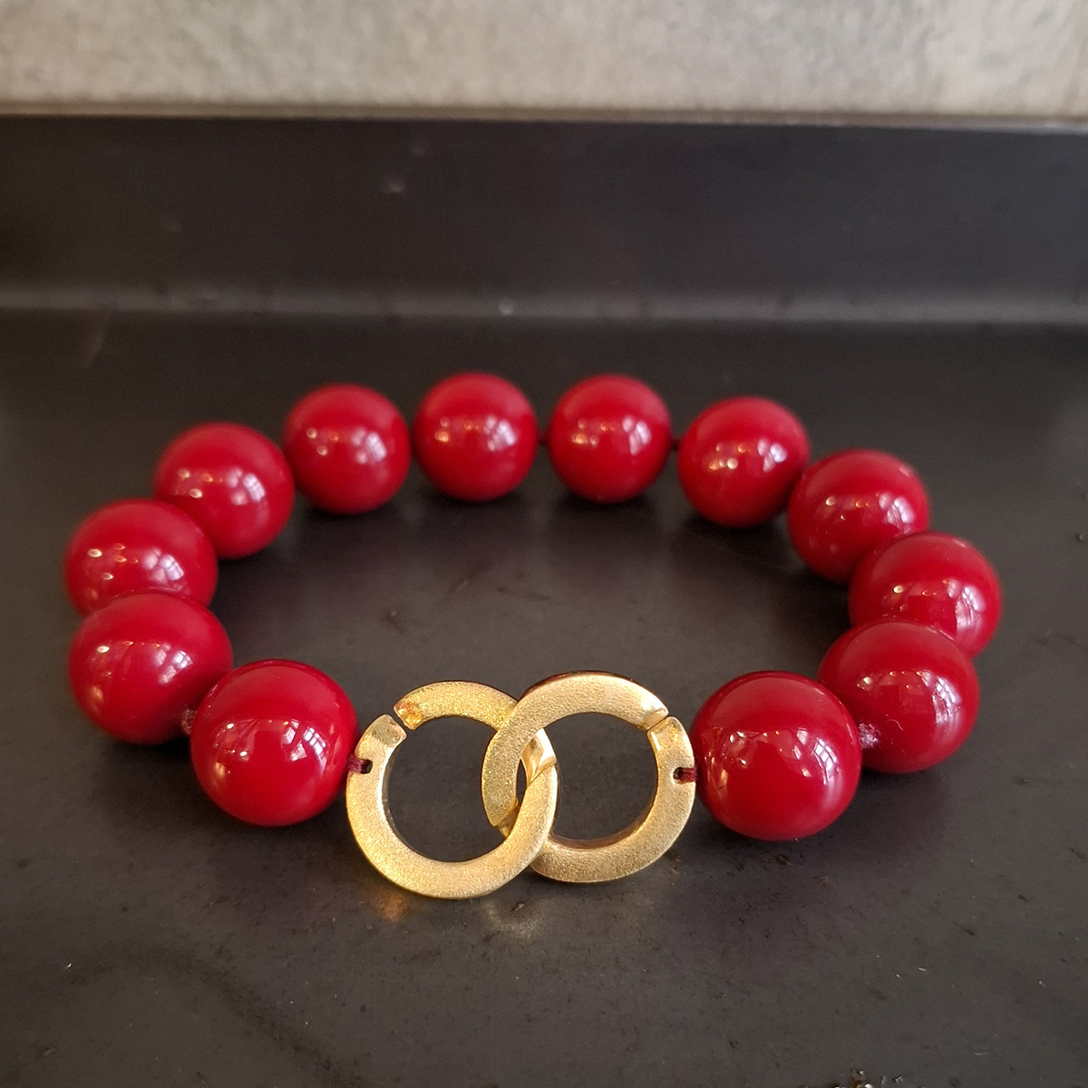Επισμαλτωμένο mother of pearl σε σκούρο κόκκινο χρώμα με διάσταση πέτρας 14 χιλιοστά, και επιχρυσωμένο ασήμι 925ο! Δεμένες πέτρες με μεταξοκλωστή και κόμπους ενδιάμεσα, συνθέτουν ένα βραχιόλι συνολικού μήκους 20 εκατοστών, το οποίο μπορείτε να συνδυάσετε με το αντίστοιχο κολιέ ή να τα ενώσετε για να δημιουργήσετε ένα μακρύτερο κολιέ!
