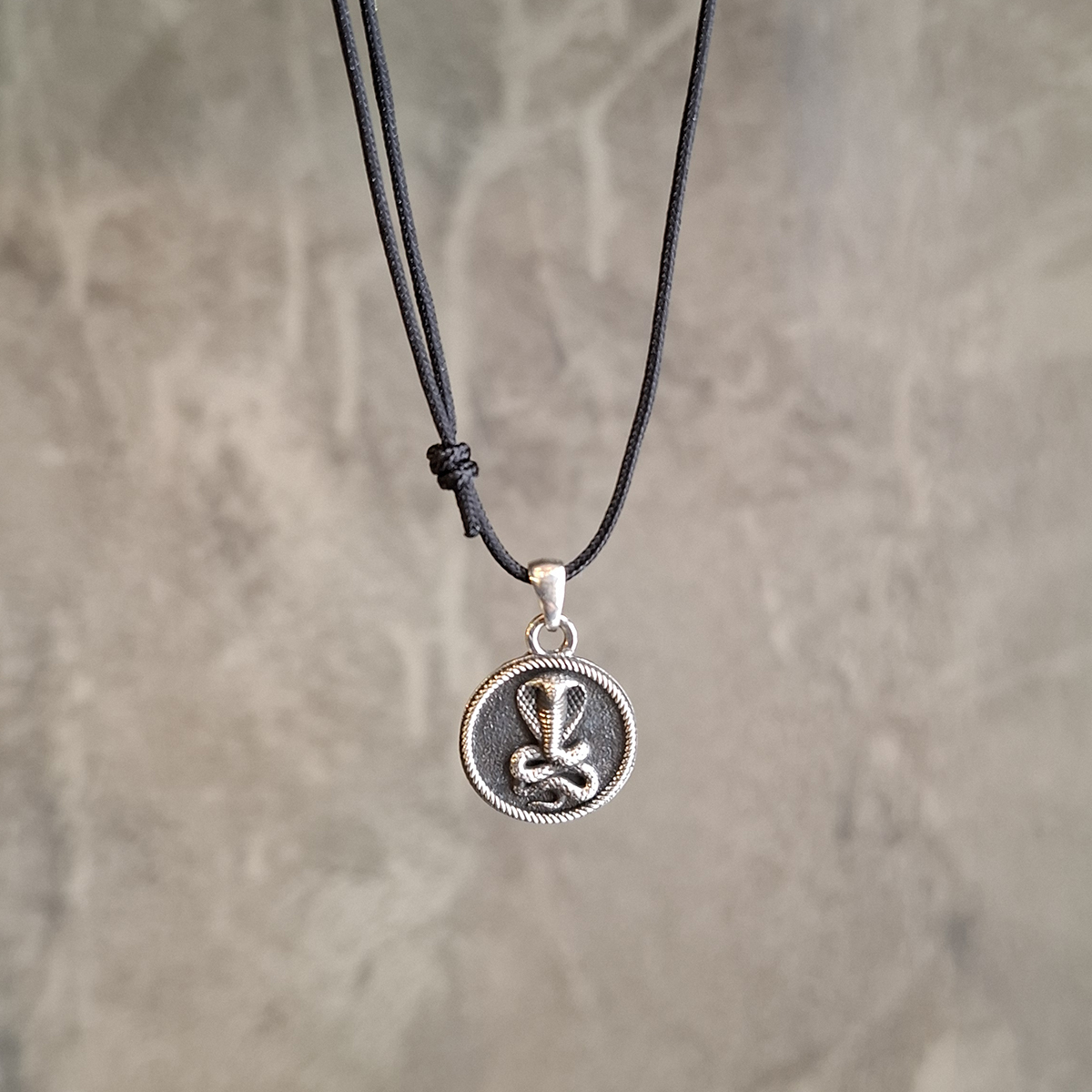 Ένα μενταγιόν διαμέτρου 1,5 εκατοστό από οξειδωμένο ασήμι 925ο με απεικόνιση κόμπρας, από τους Έλληνες κατασκευαστές της εταιρείας ILIOS! Διαχρονικό και εύκολο για το απόλυτο layering! Συνοδεύεται από κορδόνι που το αυξομειώνετε εσείς στο επιθυμητό μήκος.