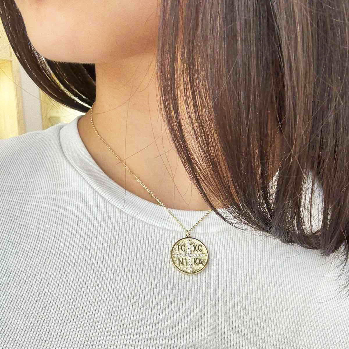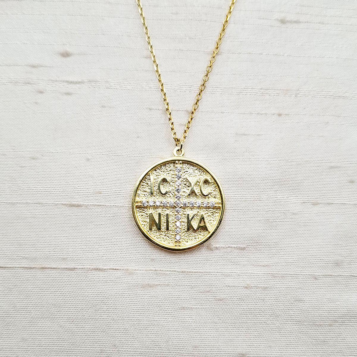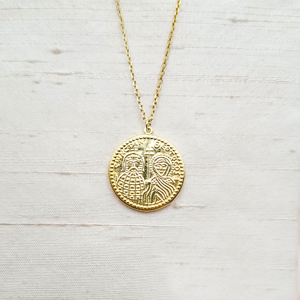 Κωνσταντινάτο μενταγιόν από ασήμι 925ο επίχρυσο με δύο όψεις και λευκά zircon! Με διάμετρο 2,5 εκατοστά και αλυσίδα 40 εκατοστών, ένα απλό και συμβολικό κόσμημα!