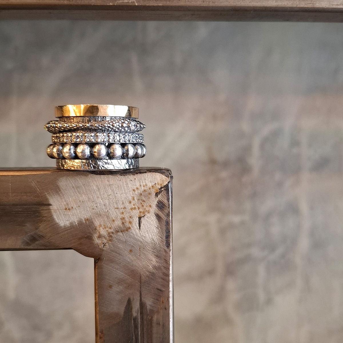 Ο συνδοιασμός χρυσού 18 καρατίων και οξειδωμένου ασημιού 925ο δημιουργεί ένα δυναμικό stack,όπου κάθε στοιχείο έχει τη δική του προσωπικότητα αλλά μαζί σχηματίζουν ένα εντυπωσιακό σύνολο.