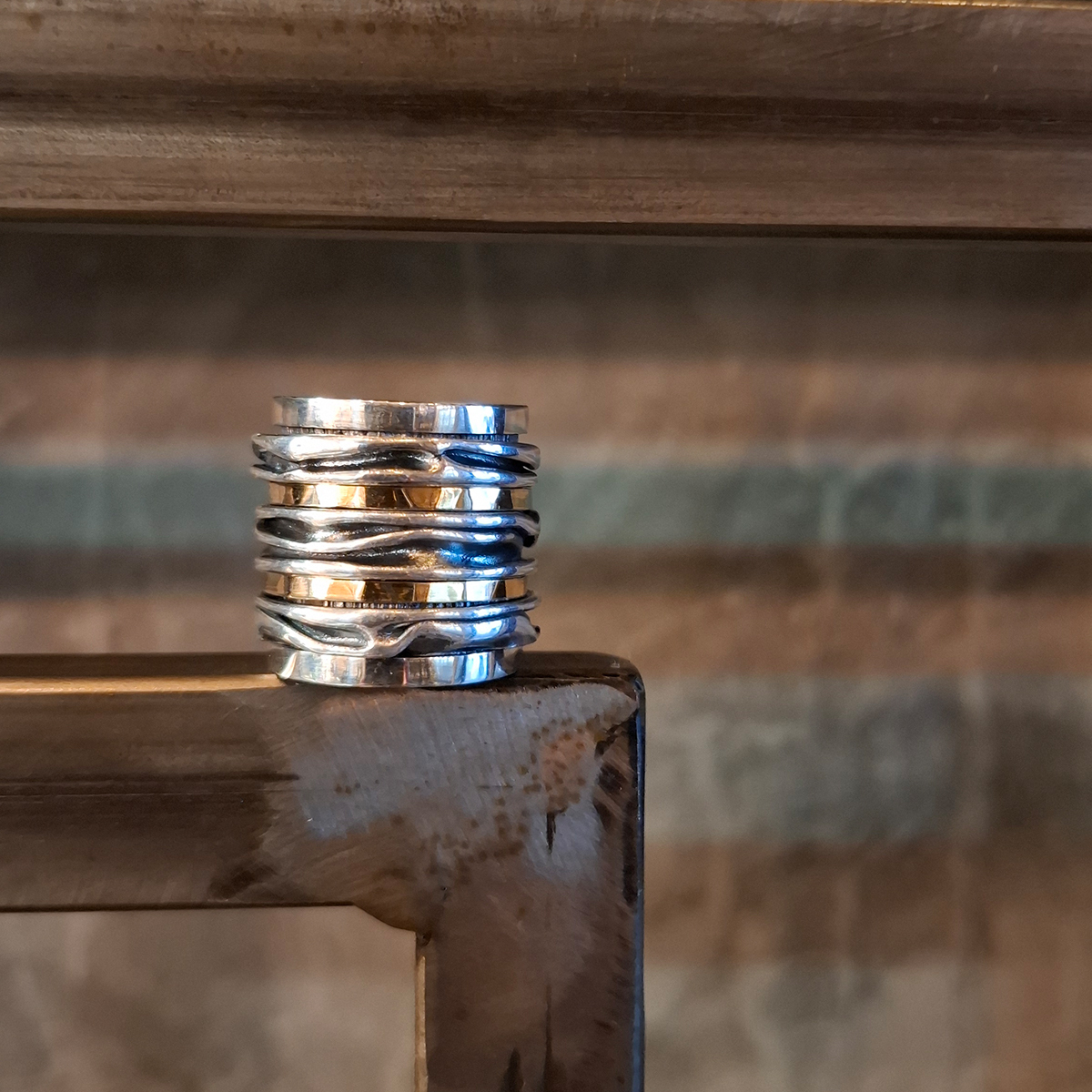 Ένα εντυπωσιακό δαχτυλίδι από ασήμι 925ο και χρυσό 18 καρατίων, που συνδυάζονται αρμονικά. Ο πολυεπίπεδος σχεδιασμός του με τις κυματιστές λεπτομέρειες δίνει κίνηση και χαρακτήρα, μετατρέποντας το σε ένα ξεχωριστό statement κόσμημα. Επικοινωνήστε μαζί μας για να σας βοηθήσουμε με το νούμερό σας.
