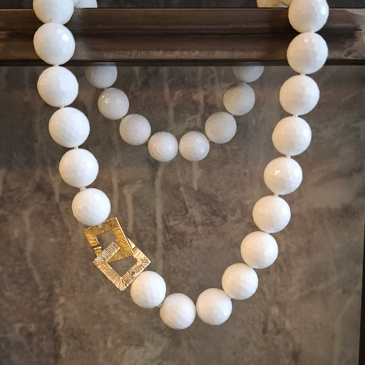Ο λευκός όνυχας προσδίδει ισορροπία και αυτοέλεγχο! Χειροποίητο κολιέ μήκους 50 εκατοστών, με ταγέ πέτρες 14 χιλιοστών, περασμένες σε μεταξοκλωστή με κόμπους μία προς μία και ασημένιο 925ο, επιχρυσωμένο, κούμπωμα. Συνδυάστε το με το ίδιο βραχιόλι ή ενώστε τα και δημιουργήστε ένα μακρύτερο κολιέ!