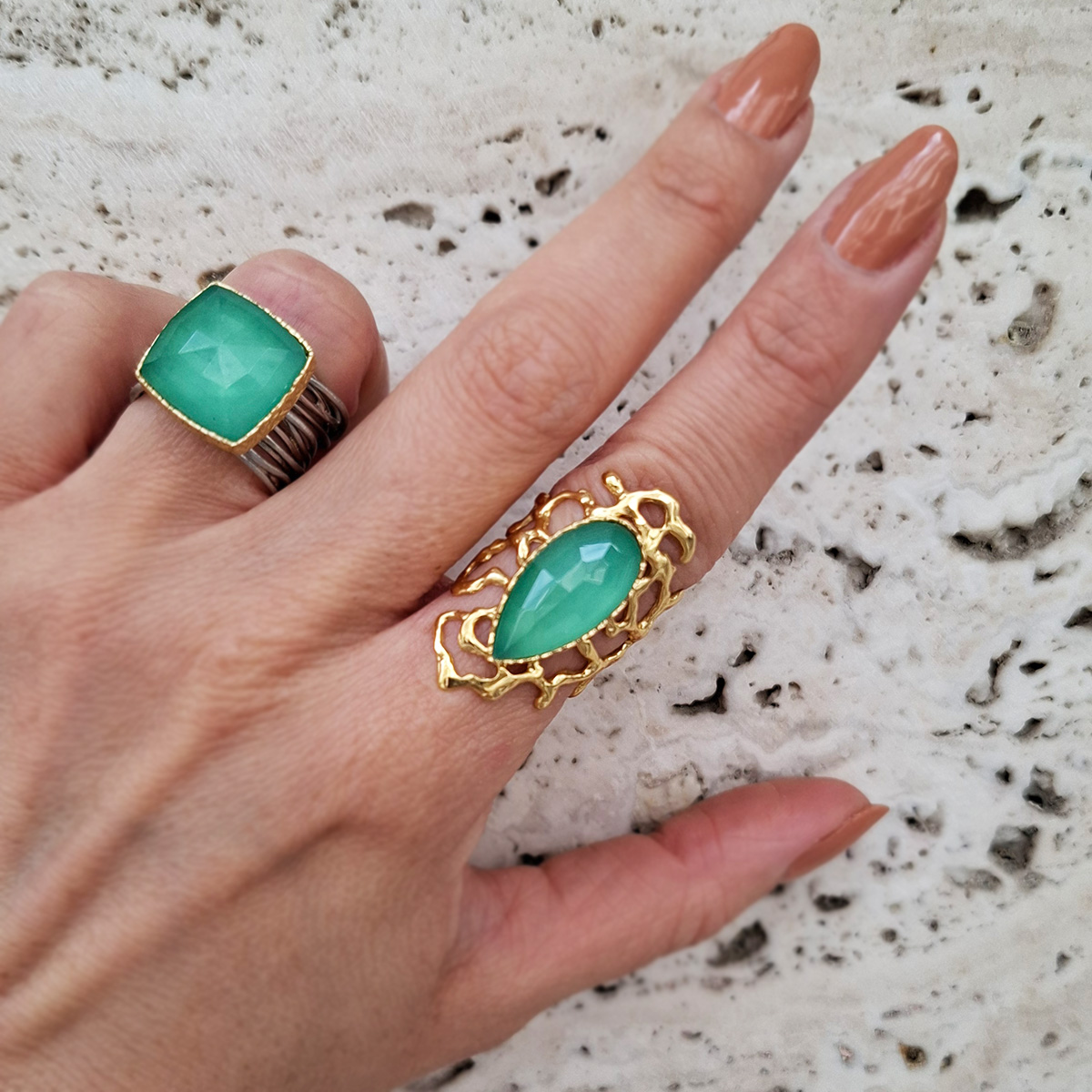 Αβεντουρίνη, ο λίθος της τύχης και της ευημερίας, συνδυάζεται περίτεχνα με επιχρυσωμένο ασήμι 925ο και δημιουργείται ένα δαχτυλίδι άκρως εντυπωσιακό! Φορέστε το με τα σκουλαρίκια της ίδιας συλλογής και σίγουρα το αποτέλεσμα θα σας εκπλήξει!! Ανοιχτό στο κάτω μέρος του για να προσαρμόζεται εύκολα στο νούμερό σας.