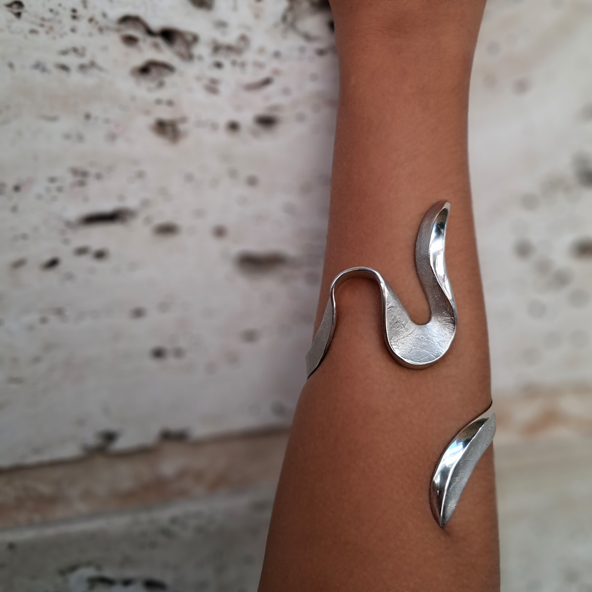 Σταθερό βραχιόλι ξετυλίγεται περίτεχνα και γίνεται ένα με το χέρι σας! Από επιροδιωμένο ασήμι 925ο, εμπνευσμένο από το studio ELEFTHERIOU! Συνδυάστε το απόλυτα με τα κοσμήματα της ίδιας συλλογής μας!