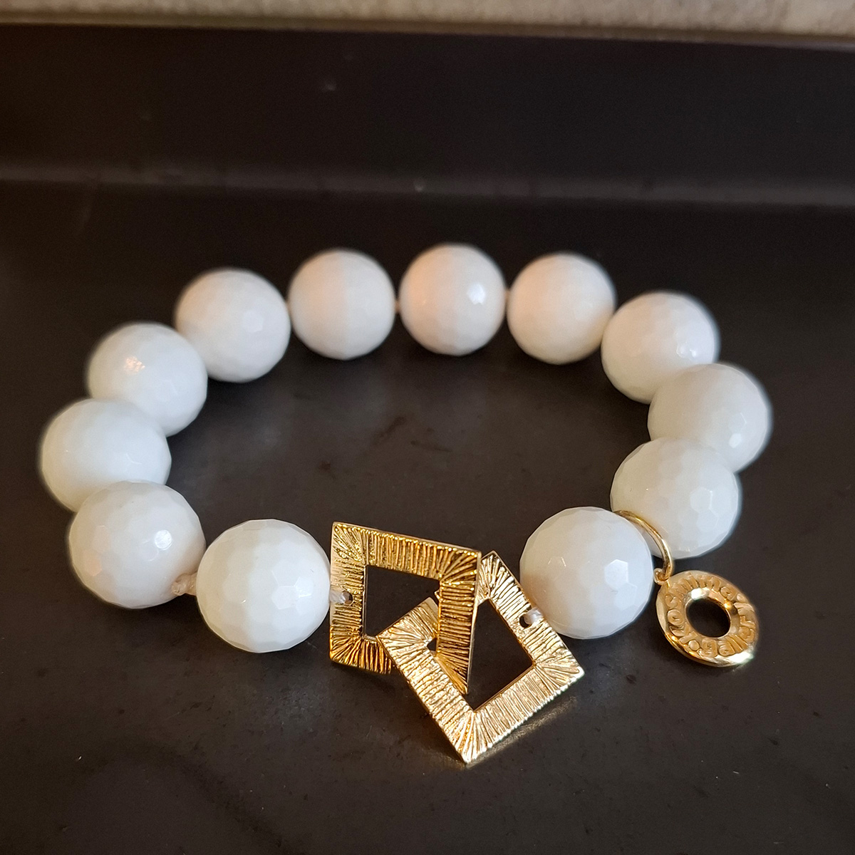 Χειροποίητο βραχιόλι, μήκους 20 εκατοστών, από υπέροχες πέτρες λευκού όνυχα 14 χιλιοστών, που εμπνέουν ηρεμία και γαλήνη! Περασμένες σε μεταξοκλωστή με κόμπους ενδιάμεσα και επίχρυσο κούμπωμα από ασήμι 925ο. Συνδυάστε το με ίδιο WHITE ONYX κολιέ ή ενώστε τα και δημιουργείστε ένα μακρύτερο κολιέ!