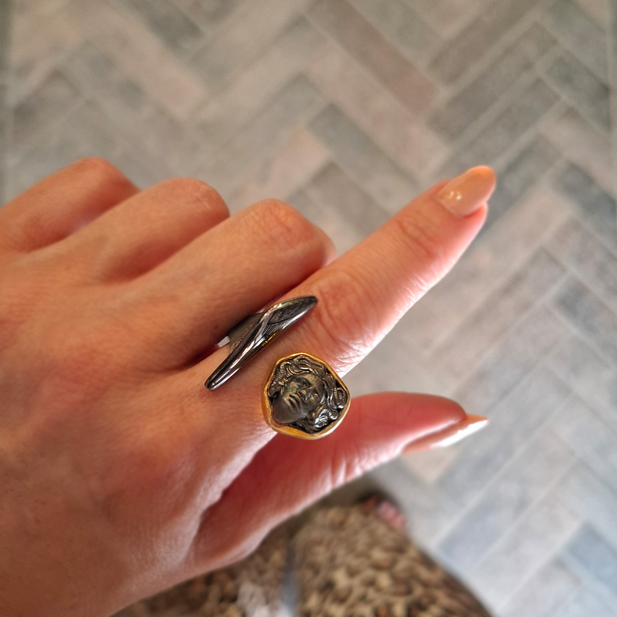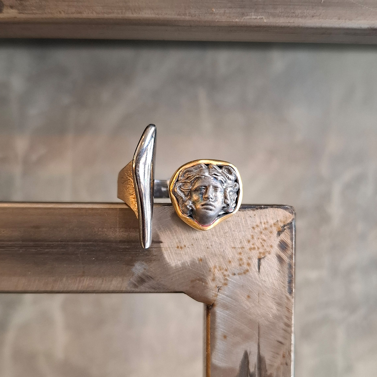 Χειροποίητο, ανοιχτό δαχτυλίδι με ανάγλυφο το κεφάλι της μυθικής Μέδουσας, από την Μαρία Ελευθερίου! Από ασήμι 925ο, με δύο διαφορετικές επιμεταλλώσεις. Συνδυάζεται με το MEDUSA cuff bracelet και το MEDUSA necklace!