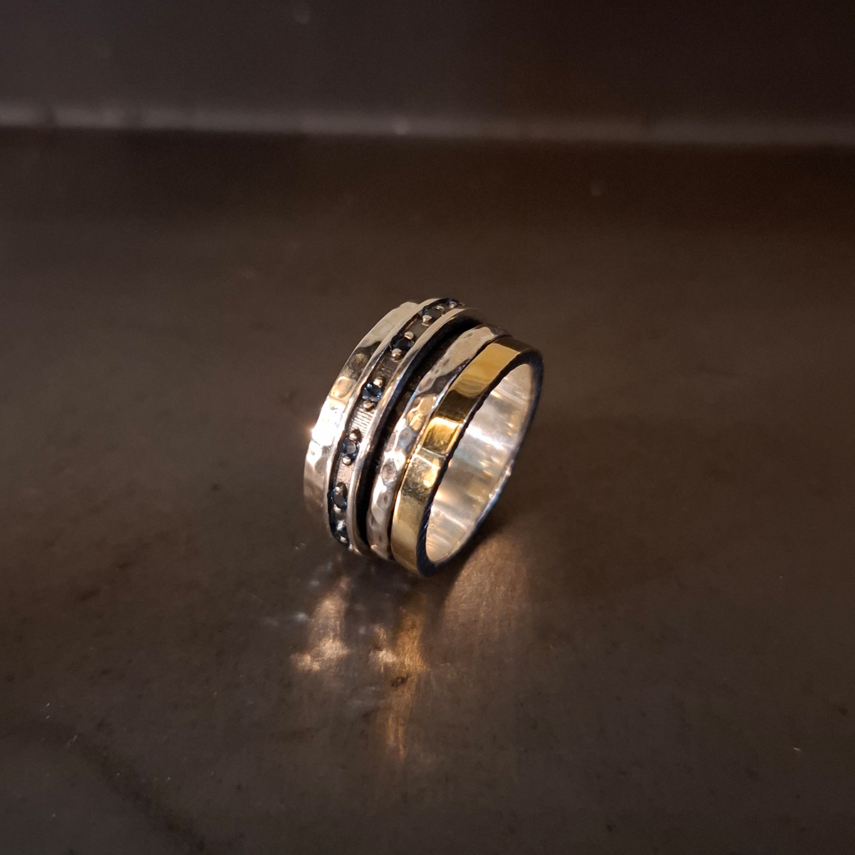 Κομψό και μοντέρνο δαχτυλίδι από ασήμι 925ο με λεπτομέρειες από χρυσό 18 καρατίων, διακοσμημένο με εντυπωσιακές πέτρες London Blue Topaz. Επικοινωνήστε μαζί μας για να σας βοηθήσουμε με το νούμερό σας.