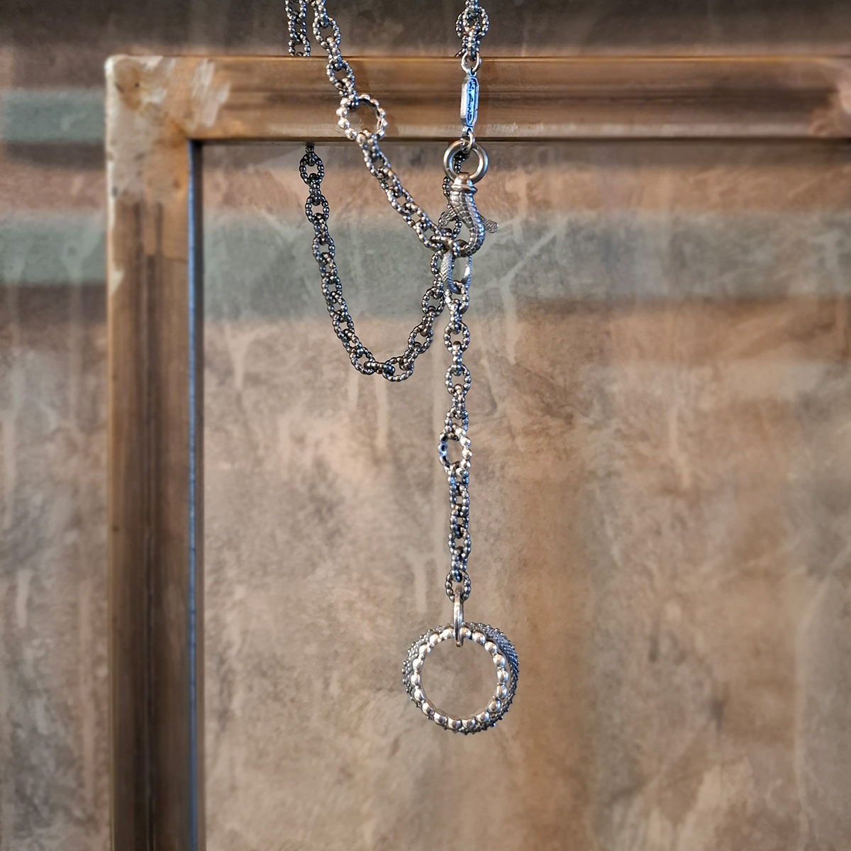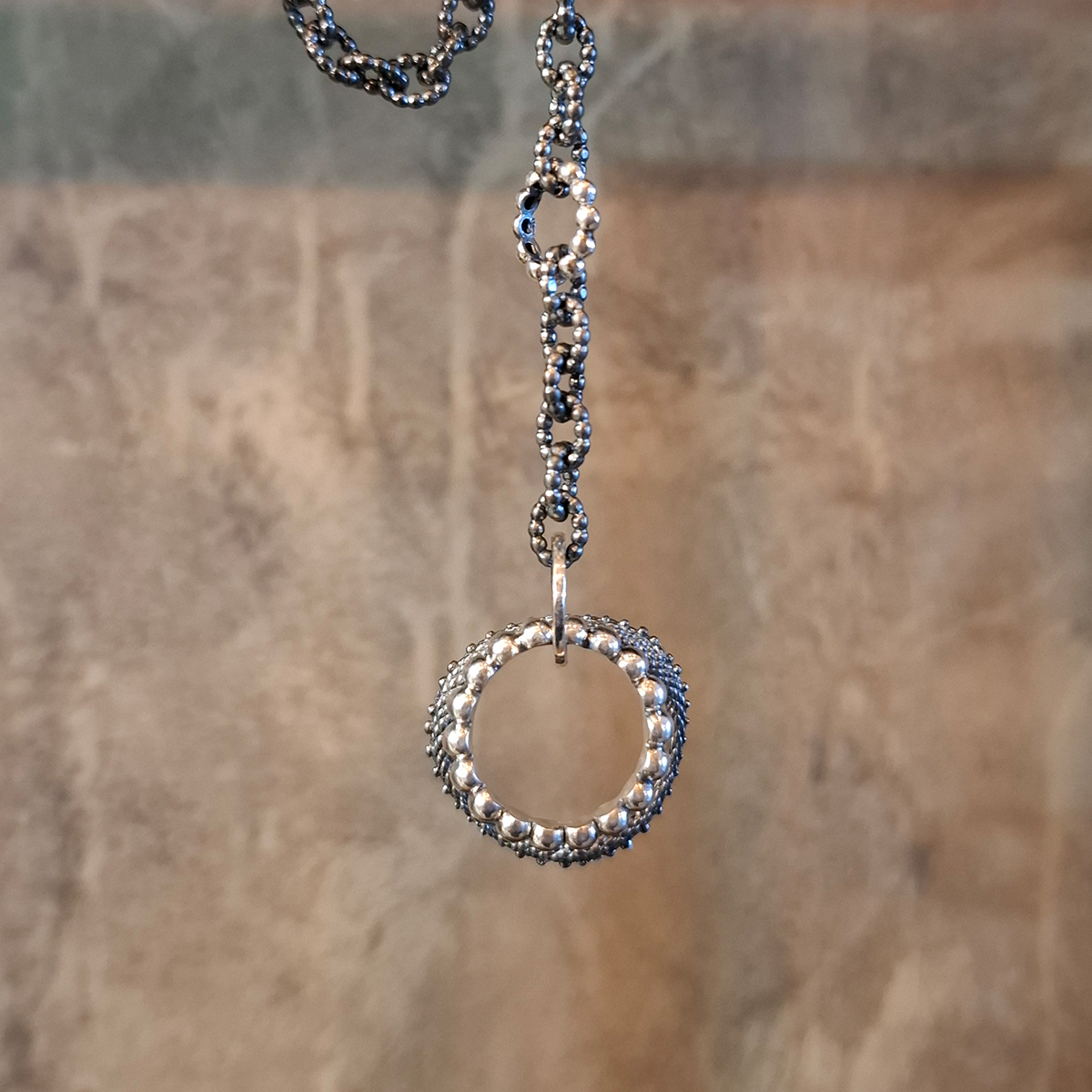 Η σχεδιάστρια Κατερίνα Ανδριγιαννάκη δημιουργεί ένα κολιέ από ασήμι 925ο με κομψή αλυσίδα και εντυπωσιακό κυκλικό στοιχείο διακοσμημένο με λαμπερές πέτρες. Ο διαχρονικός του σχεδιασμός το καθιστά ιδανικό για καθημερινές ή πιο ιδιαίτερες εμφανίσεις, προσθέτοντας κομψότητα και λάμψη σε κάθε σύνολο!