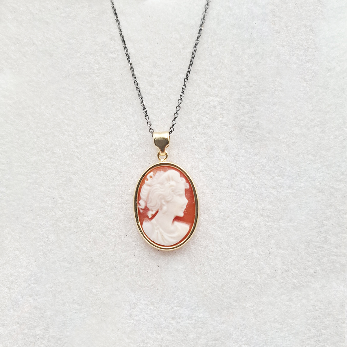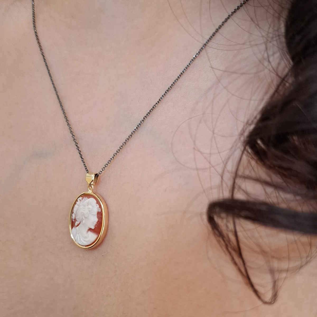 Η τέχνη των καμέο έχει ρίζες στην αρχαιότητα και στον μεσαίωνα. Λιθογλυπτική πάνω σε κοχύλι δημιουργεί ένα γυναικείο πρόσωπο και εμείς με τη σειρά μας δένουμε χειροποίητα την πέτρα αυτήν με χρυσό 9 καρατίων. Ένα μενταγιόν που σίγουρα κάνει εντύπωση! Έχει διαστάσεις 22 επί 13 χιλιοστά και συνοδεύεται από ασημένια αλυσίδα με μαύρο ρόδιο, μήκους 42 εκατοστών με προέκταση.