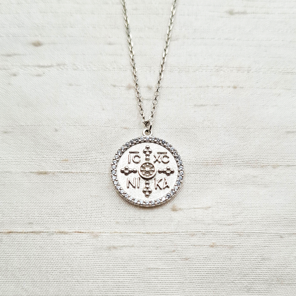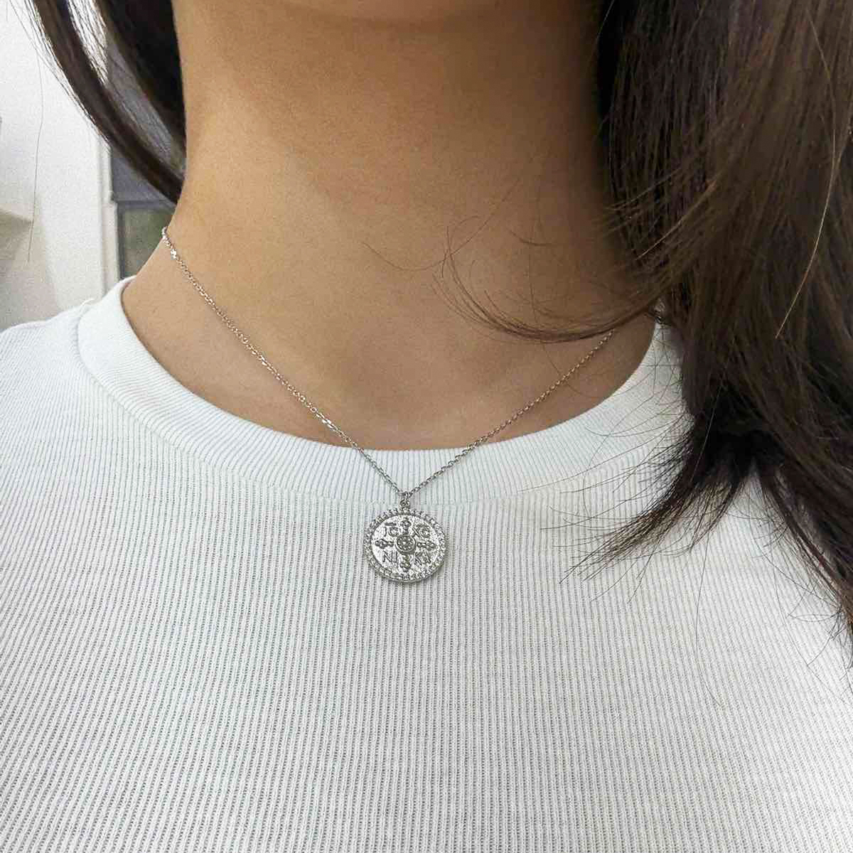 Λευκό κωνσταντινάτο από επιροδιωμένο ασήμι 925ο, δύο όψεων και μικρά zircon! Με διάμετρο 2 εκατοστά και αλυσίδα μήκους 40 εκατοστών, μπορεί να συνδυαστεί με διάφορα άλλα κοσμήματα αλλά και μόνο του για μια πιο καθημερινή εμφάνιση!