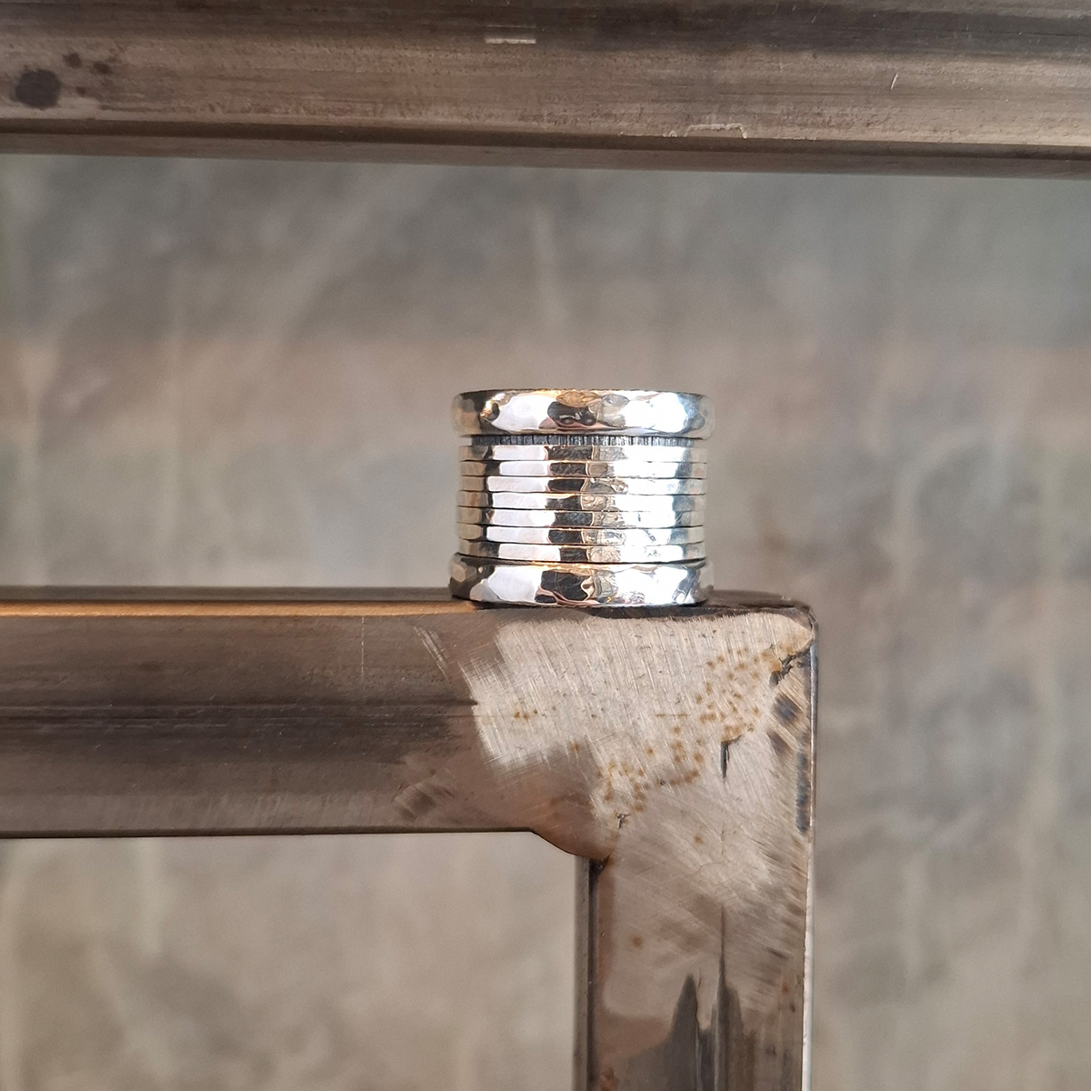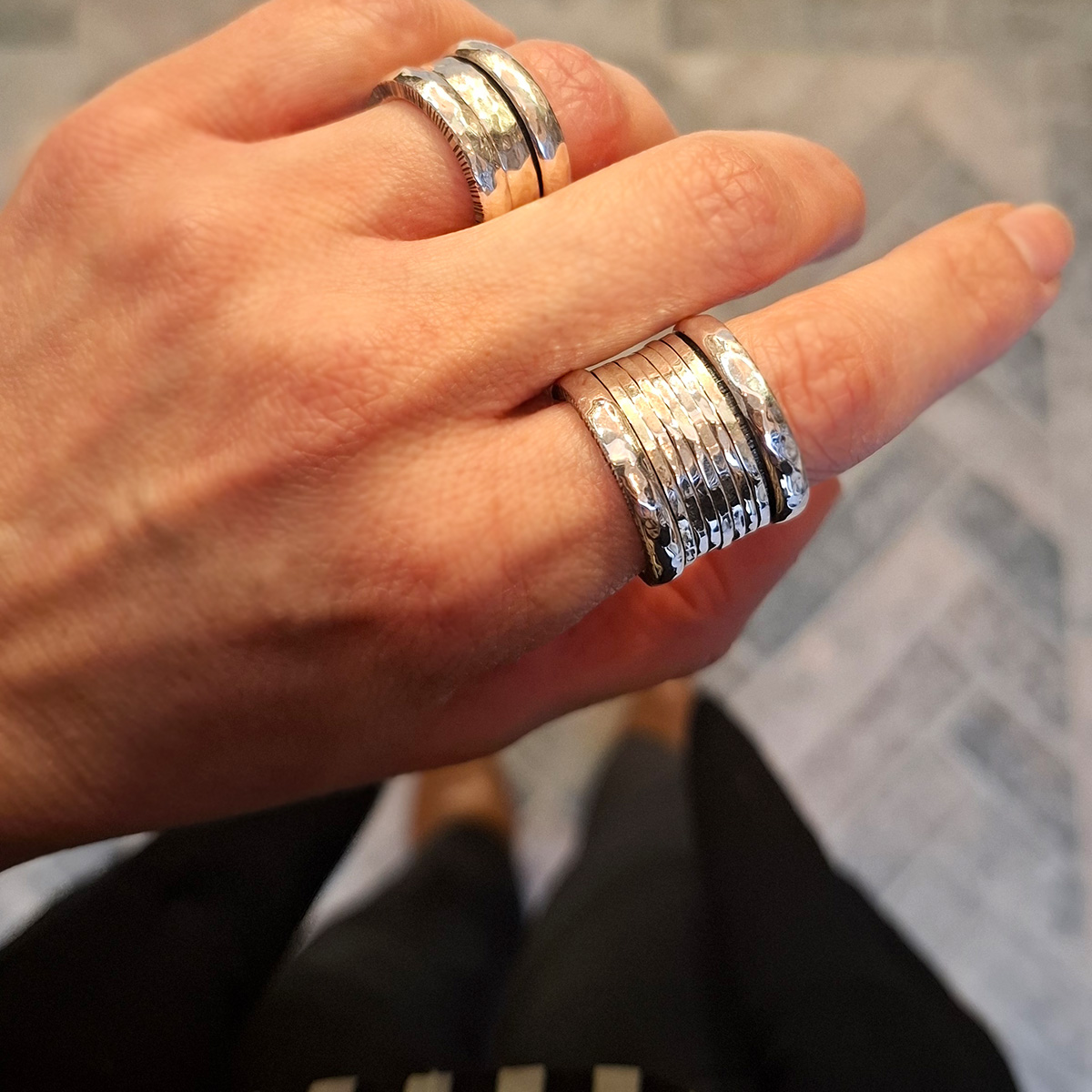 Ένα ιδιαίτερο δαχτυλίδι της σειράς κοσμημάτων K.AND., με λεπτές βέρες οι οποίες περιστρέφονται δημιουργώντας ένα δαχτυλίδι spinner από ασήμι 925ο.Μπορεί να συνδυαστεί με πολλά άλλα ασημένια κοσμήματα της σειράς!