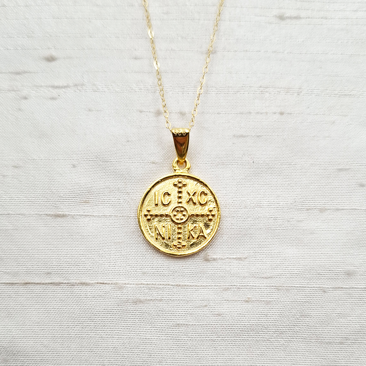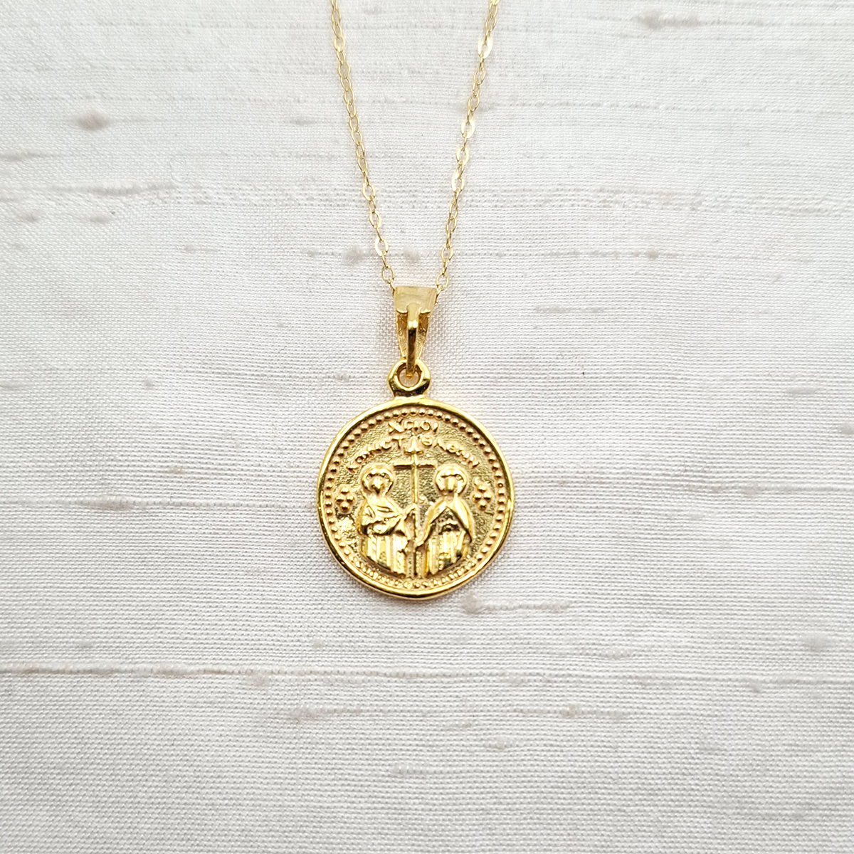 Ένα απλό, καθημερινό κωνσταντινάτο μενταγιόν διπλής όψης από ασήμι 925ο. Έχει διάμετρο 1,5 εκατοστό και συνοδεύεται από αλυσίδα μήκους 40 εκατοστών. Μπορείτε να κάνετε αμέτρητους συνδυασμούς ανάλογα με την διάθεσή σας!