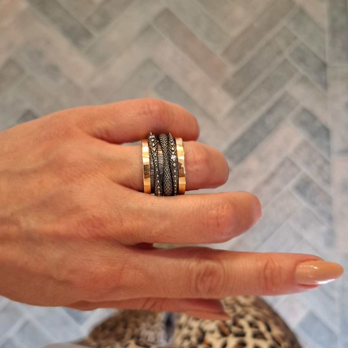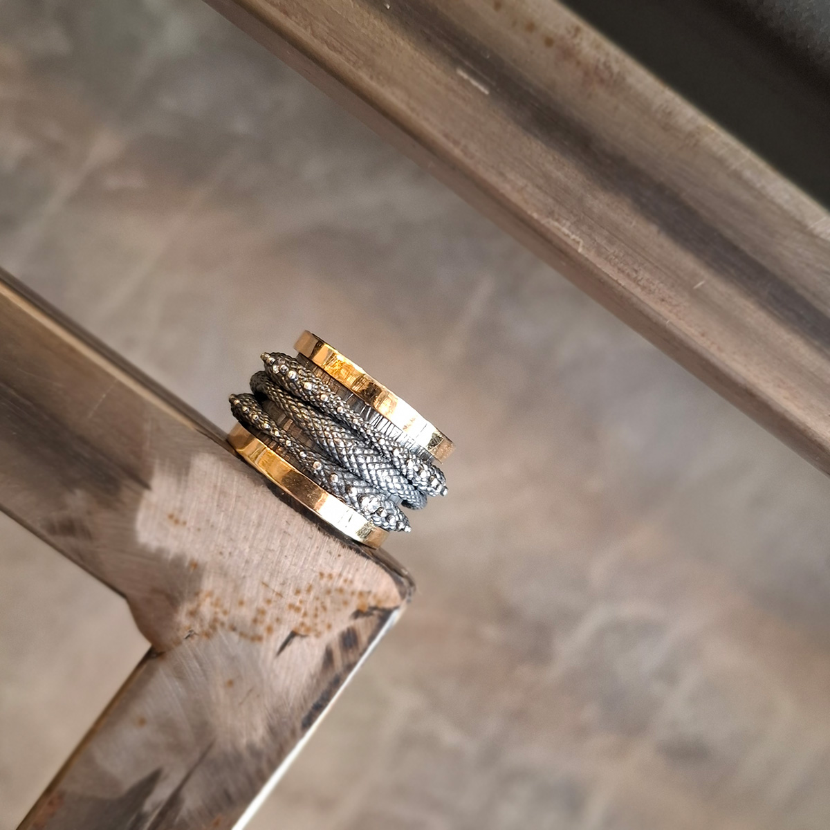 Ένα ιδιαίτερο δαχτυλίδι με σχέδιο φίδι από ασήμι 925ο, δύο βέρες χρυσού 18 καράτια και λεπτομέρειες από λευκά qubic zirkonia, μπορεί να συνδυαστεί με κάποιο παρόμοιο δαχτυλίδι της σειράς για ένα εντυπωσιακό look!Επικοινωνήστε μαζί μας για να σας βοηθήσουμε με το νούμερό σας.