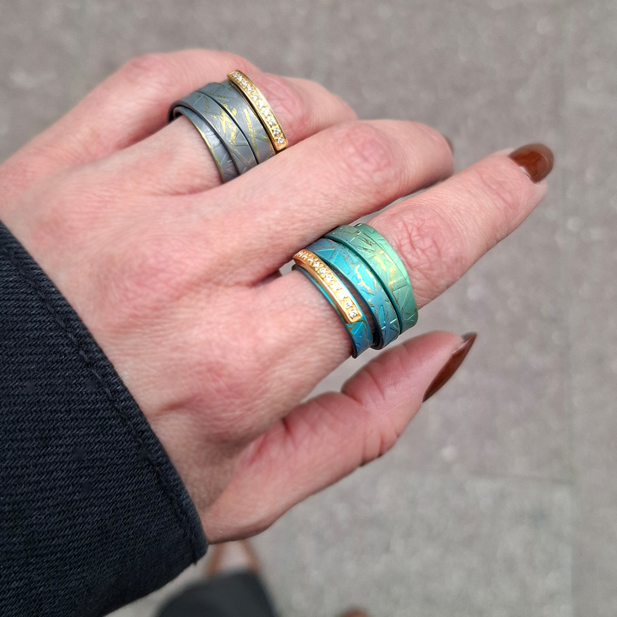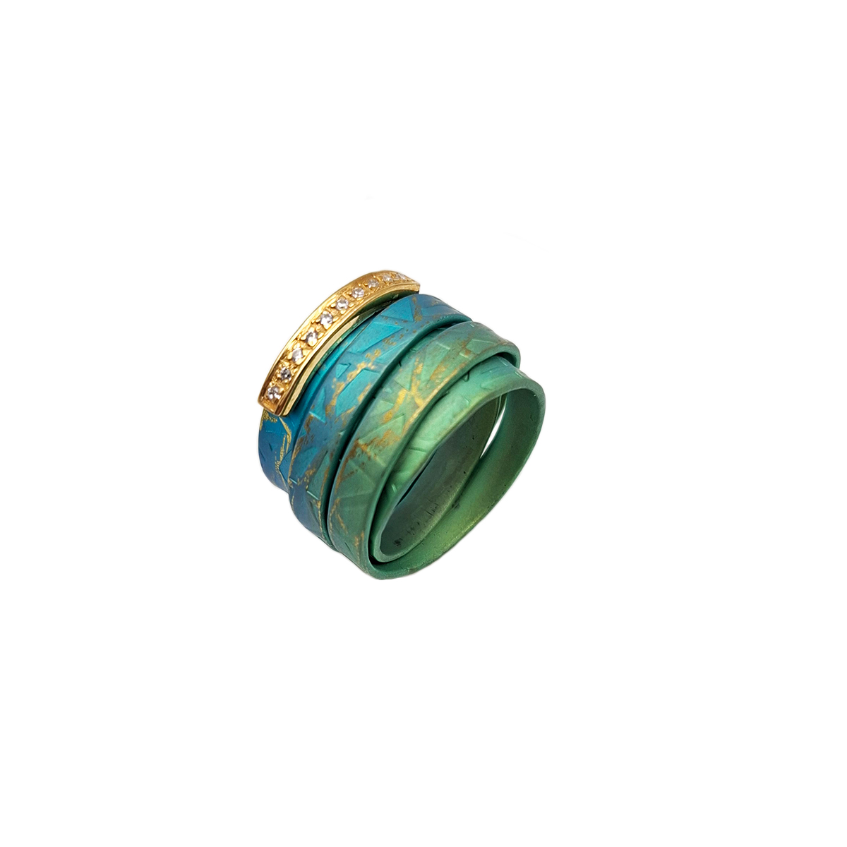 Από τη συλλογή του σχεδιαστή Vassili Giampoura, μοναδικό δαχτυλίδι από χρωματισμένο τιτάνιο και επίχρυσο ασήμι 925ο με λευκά cubic zirconia. Ένα κόσμημα που σίγουρα δεν θα περάσει απαρατήρητο!